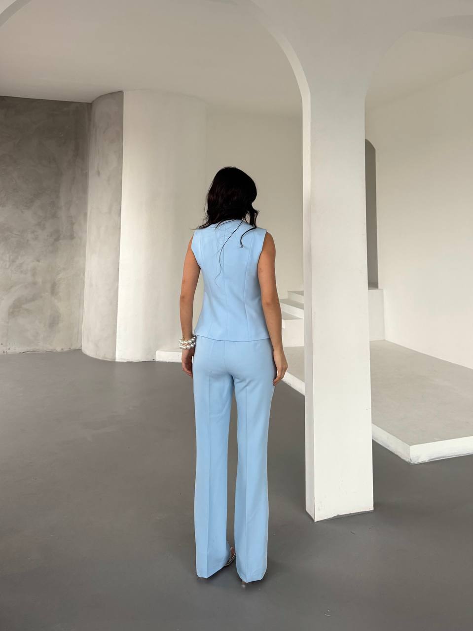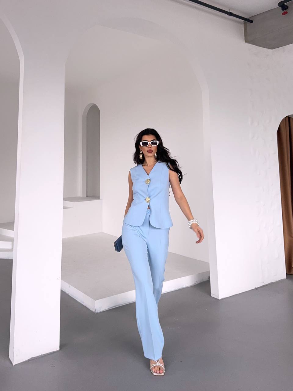 Bu takımın yelek kısmında bulunan ince dikiş detayları ve blazer ceket üzerindeki zarif düğme uygulamaları, ürünün kalitesini ve şıklığını artıran unsurlardır. Askılı yapısı sayesinde yaz aylarında rahatlıkla kullanılabileceği gibi, soğuk havalarda altına bir bluz veya tişört ekleyerek katmanlı giyimde de değerlendirilebilir. Farklı aksesuarlarla kombinlendiğinde, hem gündüz hem de gece davetlerinde göz alıcı bir tarz yaratabilirsiniz.